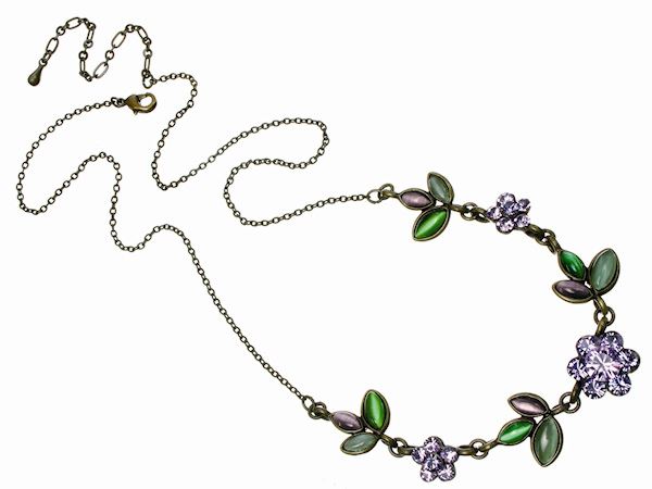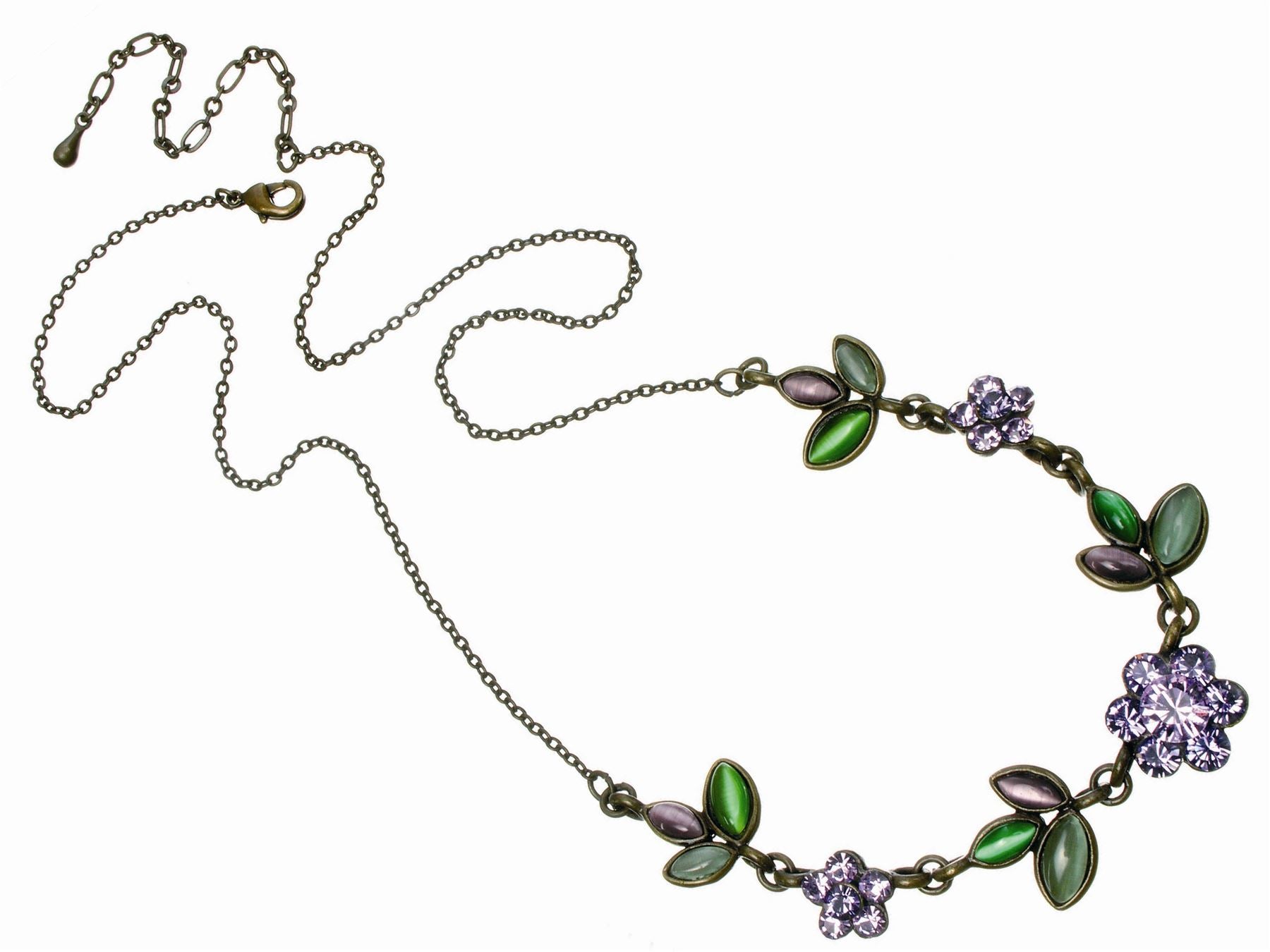 This gorgeous high-quality necklace from the premium Primrose Hill range features a beautiful flower design adorned with stunning amethyst-colored crystals and cat's eye stones. The burnished gold-colored chain adds a touch of sophistication, making it perfect for any occasion.