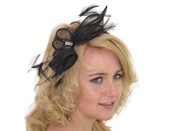 Black Crystal Loop Bow Feather Headband Hair Band Fascinator Weddings Races