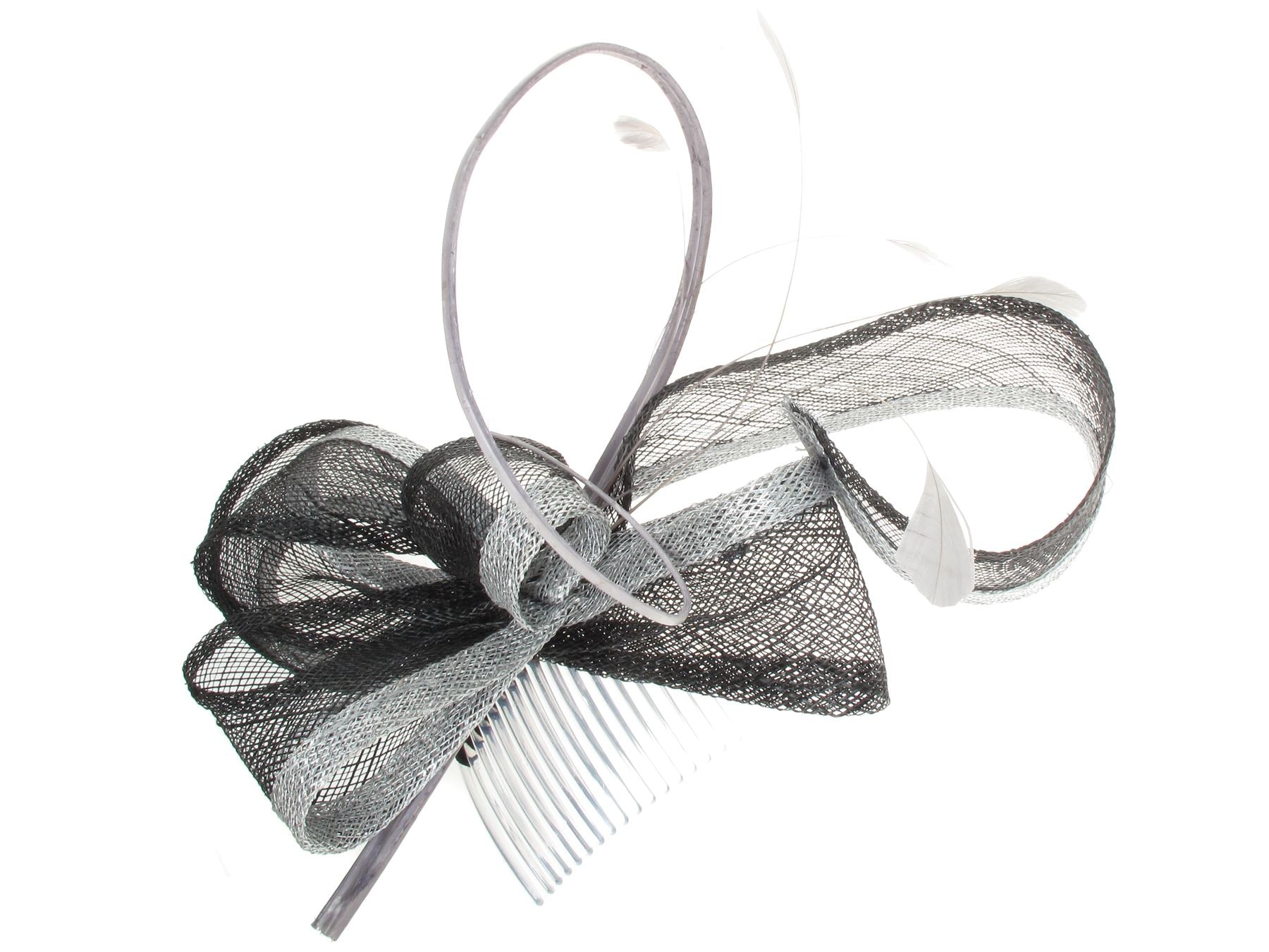 This stunning black and silver two tone loop quill feather hair comb fascinator is the perfect accessory to elevate your outfit for any special occasion.