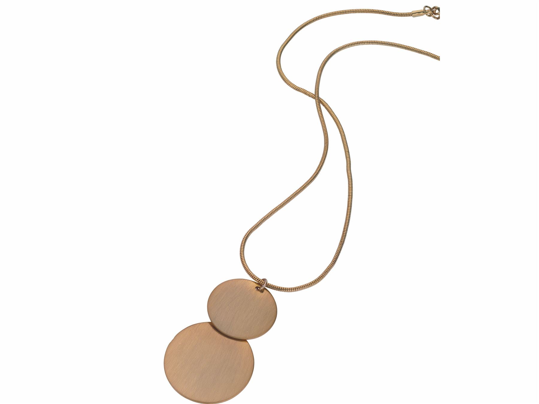 This eye-catching gold-colored pendant from the premium quality Primrose Hill range is designed to stand out. The gorgeous snake chain is adorned with a duo of brushed effect golden discs, creating a stylish and elegant look.