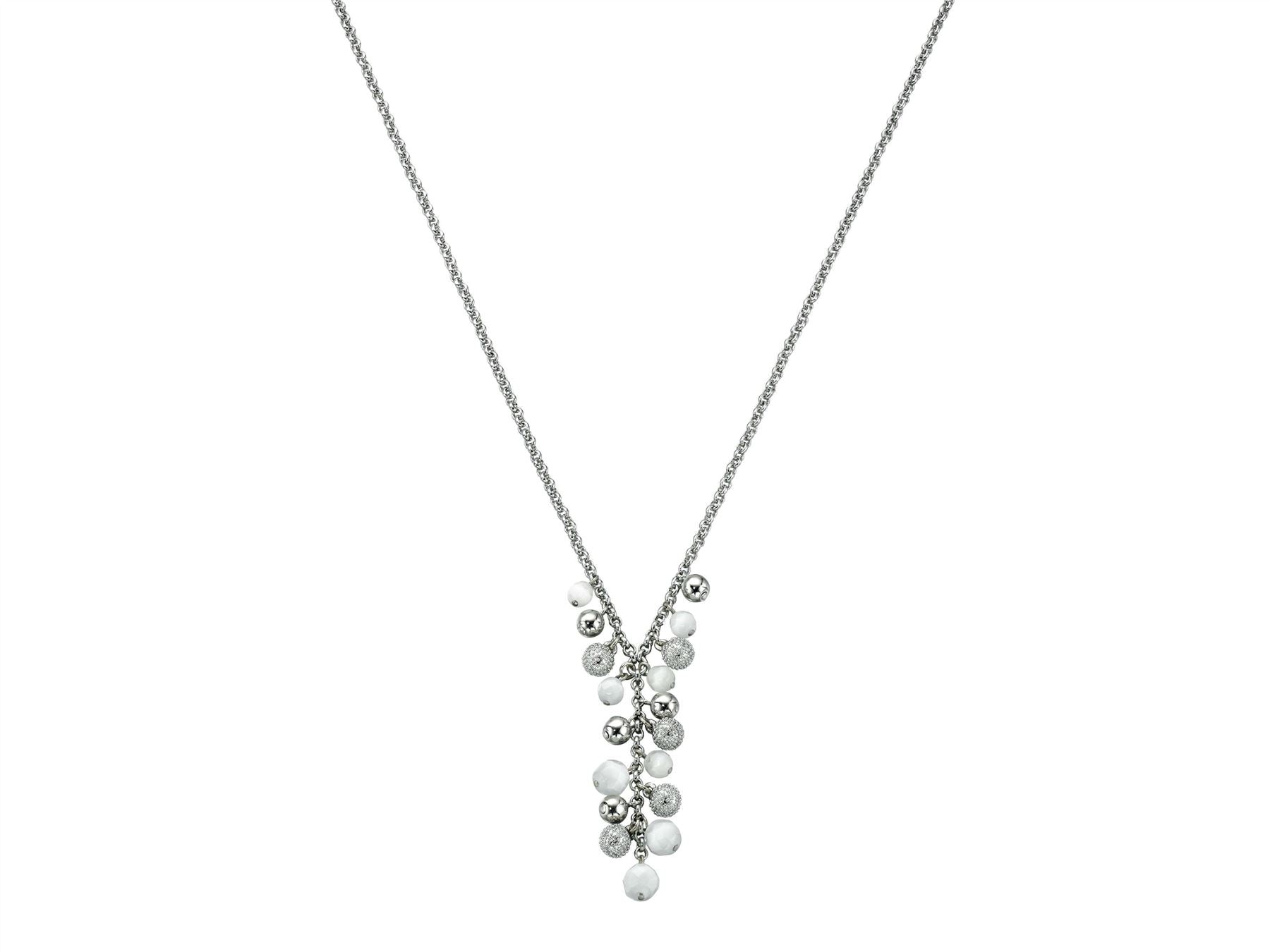 This charming necklace from the Fiorelli costume jewellery collection features a beautiful array of sphere-shaped beads. The combination of white cat's eye stones with polished and frosted silver beads creates a stunning visual appeal.