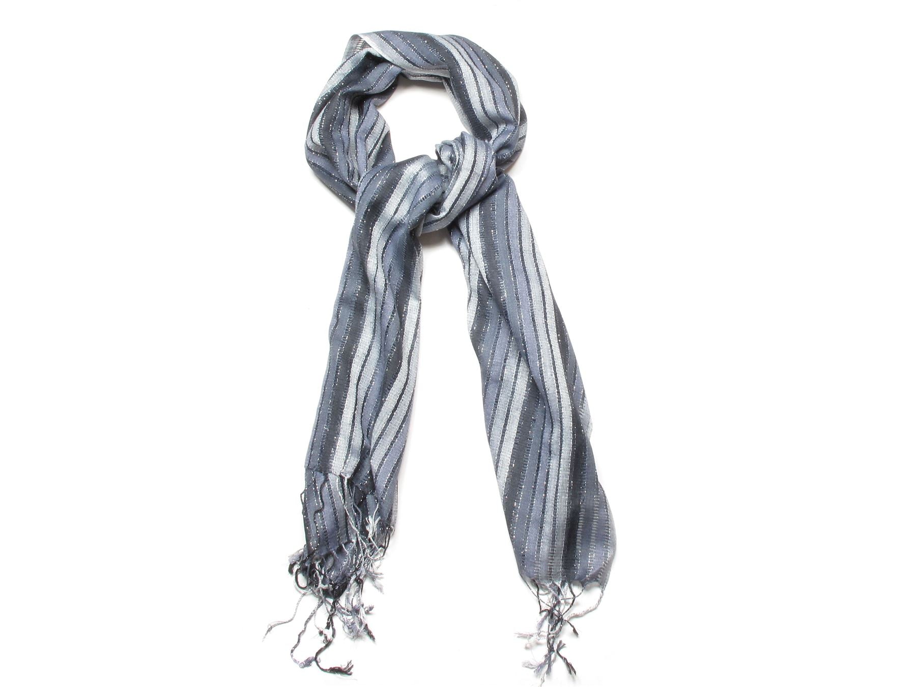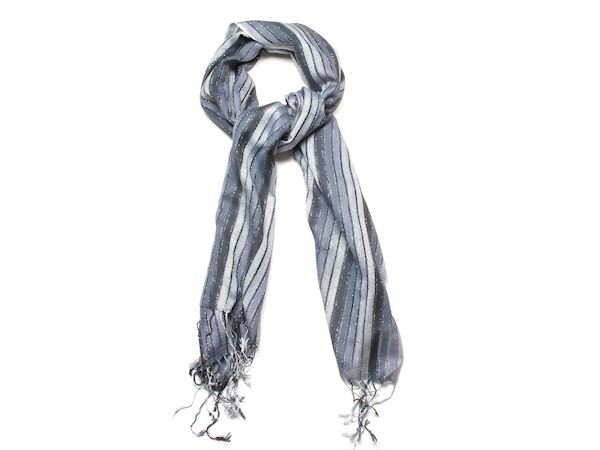 This scarf features beautiful stripes in varying shades, beautifully enhanced by metallic thread edges that add a subtle shimmer.