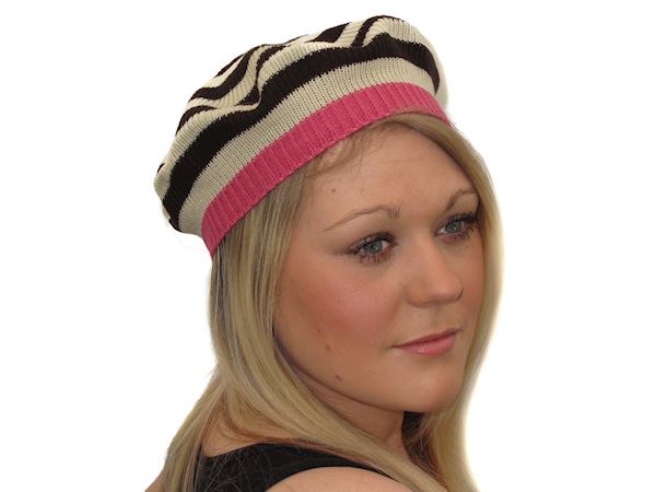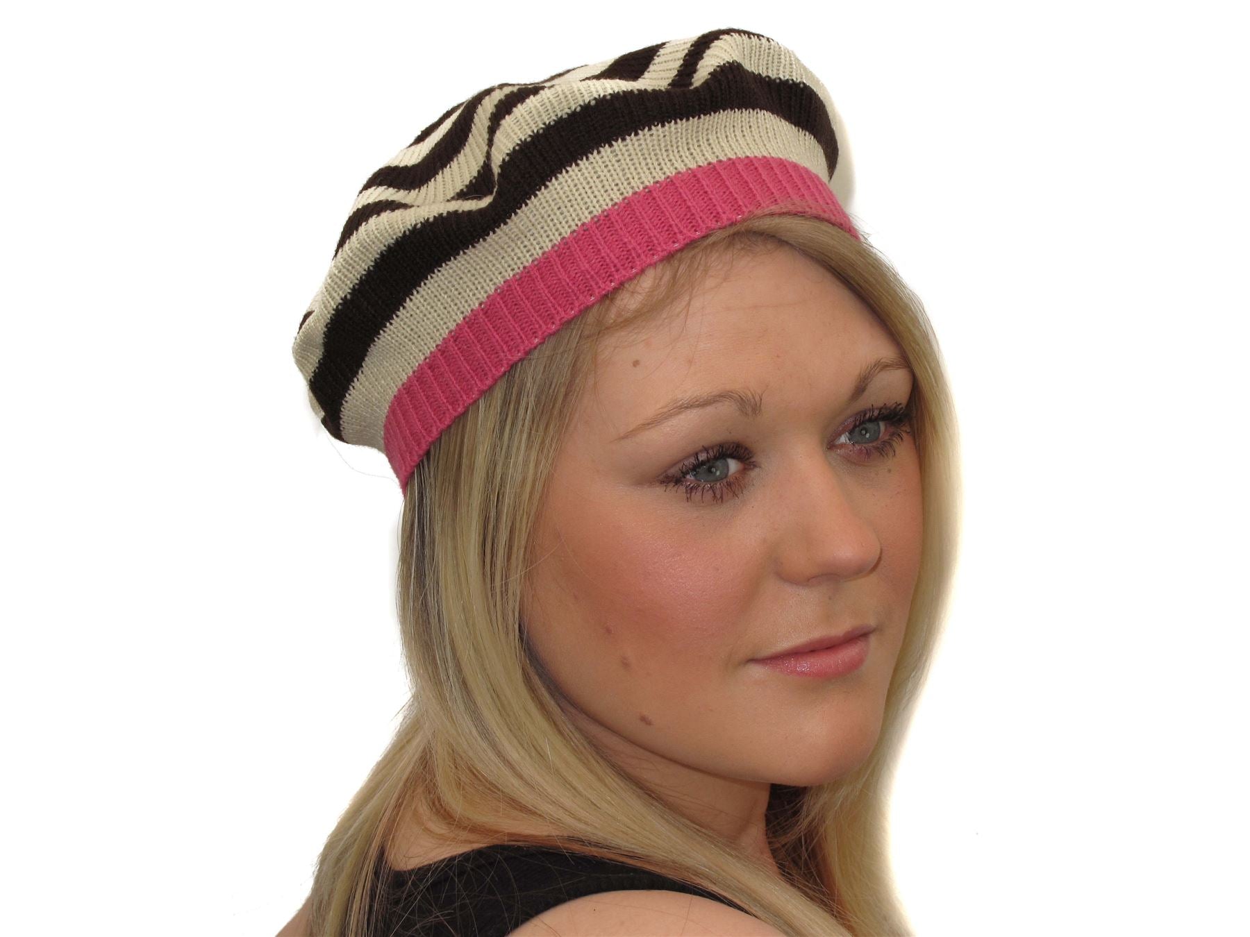 Ladies Womens Soft Warm Chocolate Brown Pink Knitted French Beret Hat
