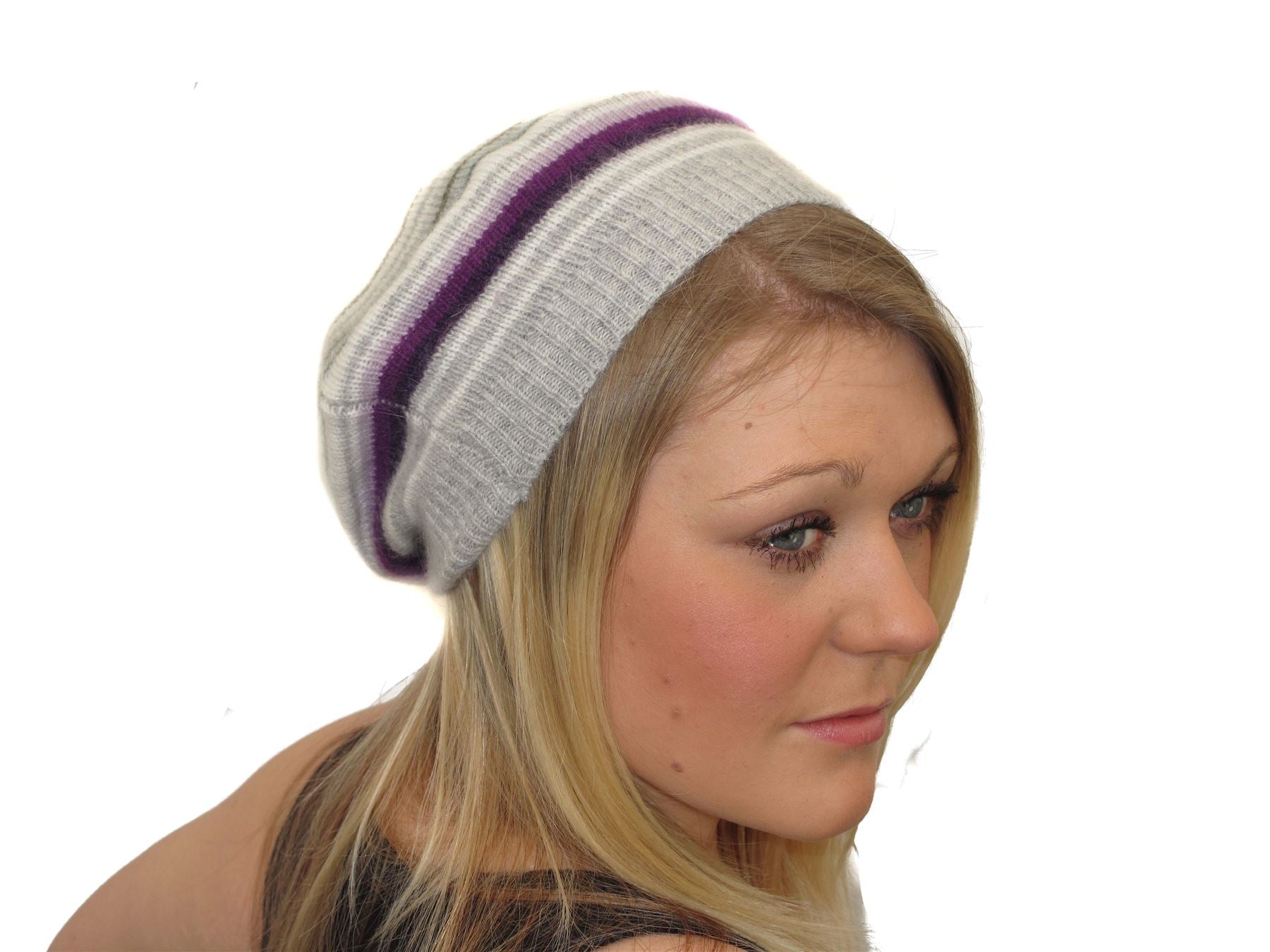 Ladies Womens Soft Warm Winter Grey Purple Stripe Knitted French Beret Hat