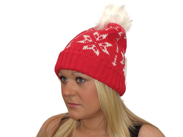 Ladies Womens Warm Thick Knitted Cherry Pink Snowflake Beanie Bobble Hat