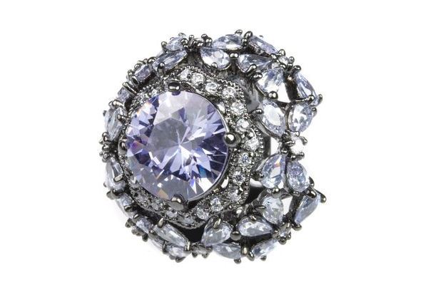 This stunning crystal encrusted cocktail ring from the Rosie Fox collection is a true statement piece. Featuring a beautiful gun metal colored setting, it showcases a large, multi-faceted lavender crystal at its center, surrounded by shimmering lavender crystals that catch the light beautifully.