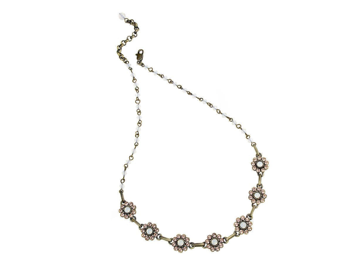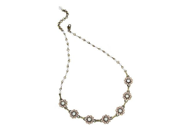 This stunning glass crystal necklace from the exclusive Primrose Hill Dainty Vintage collection features a beautiful design that is perfect for any occasion. With its antique gold colored chain and charming peach and opal multi-faceted crystals, it's a delightful addition to your jewelry collection.