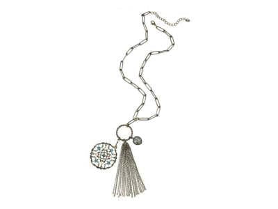 This gorgeous crystal tassel pendant from the premium quality Primrose Hill range is designed to make a statement. The antique gold coloured chain features a unique chained tassel and an ornate disc.
