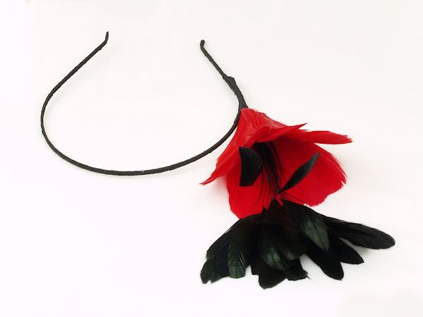 This stunning hand crafted red flower fascinator is the perfect accessory for any elegant occasion. Designed by Rosie Fox, this fascinator features a beautiful red hibiscus flower that adds a striking touch to your outfit.