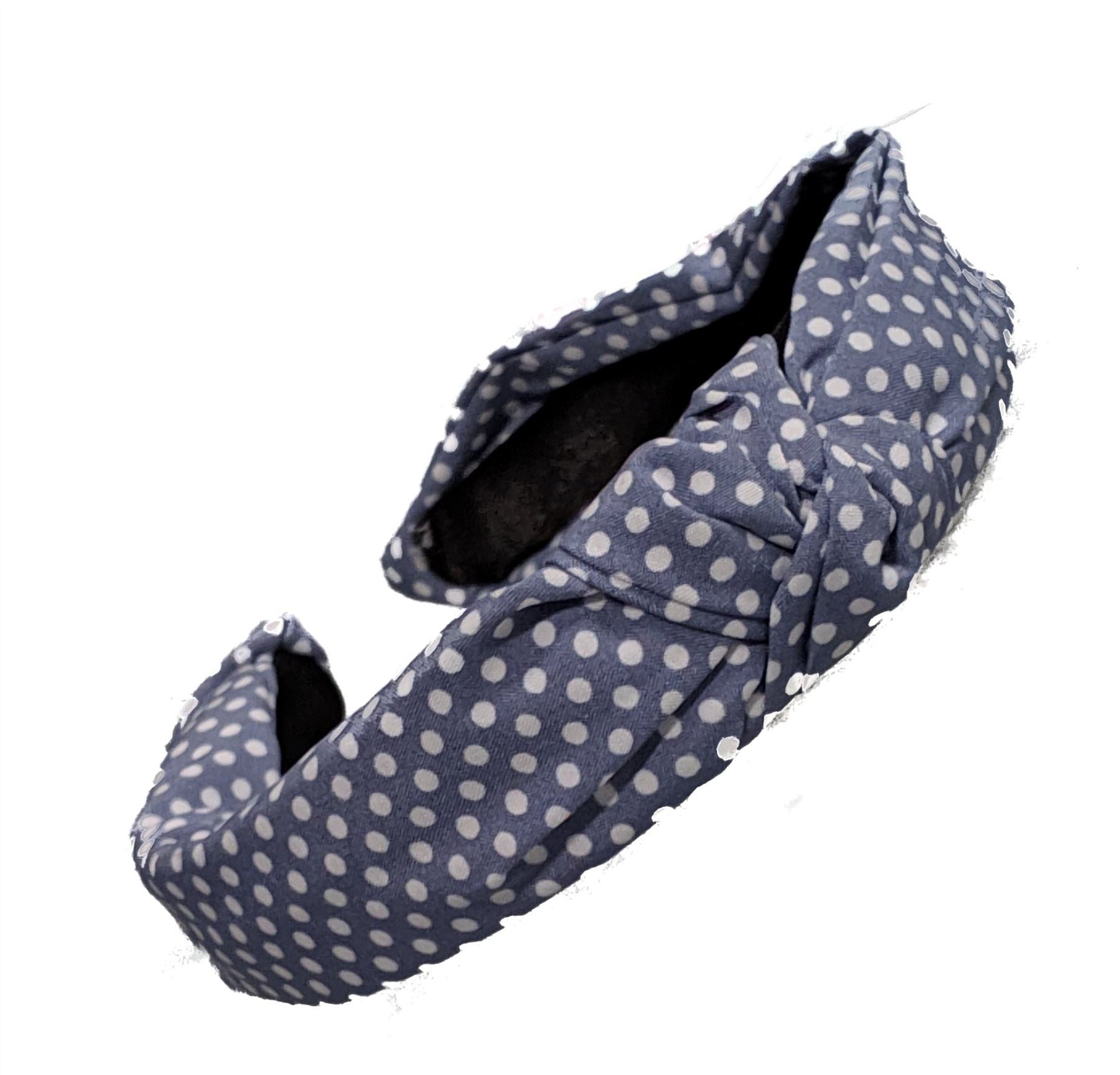This charming headband features a delightful knot style, beautifully covered in a grey polka dot fabric. Its wide plastic design ensures a comfortable fit, making it a perfect accessory for any occasion.