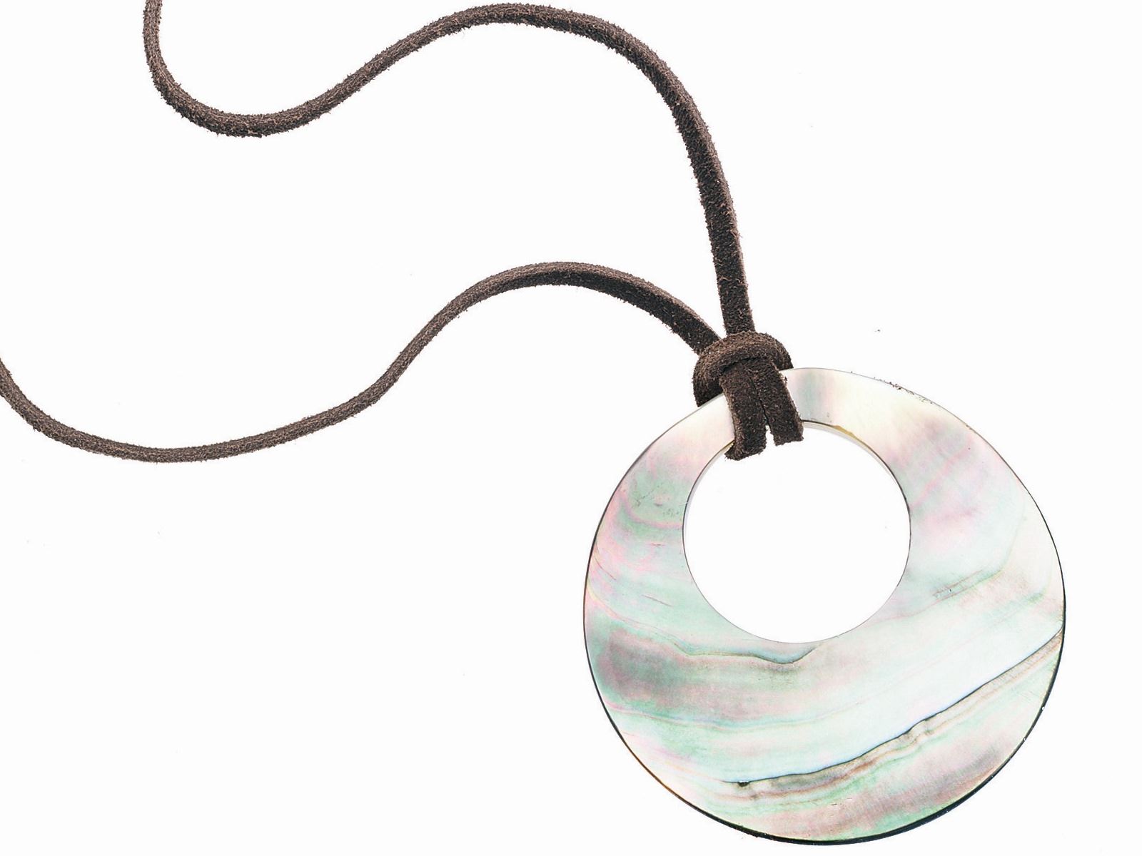 This lovely necklace features a stunning shell disc pendant mounted on a soft dark brown suede cord. Perfect for adding a touch of natural beauty to any outfit!
