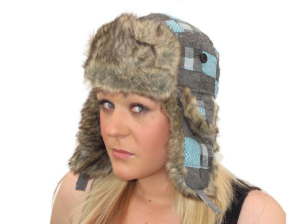 Womens Warm Blue Grey Patchwork Check Trapper Hat Ear Warmer Faux Fur
