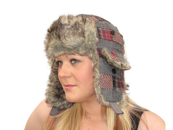 Womens Warm Pink Grey Patchwork Check Trapper Hat Ear Warmer Faux Fur